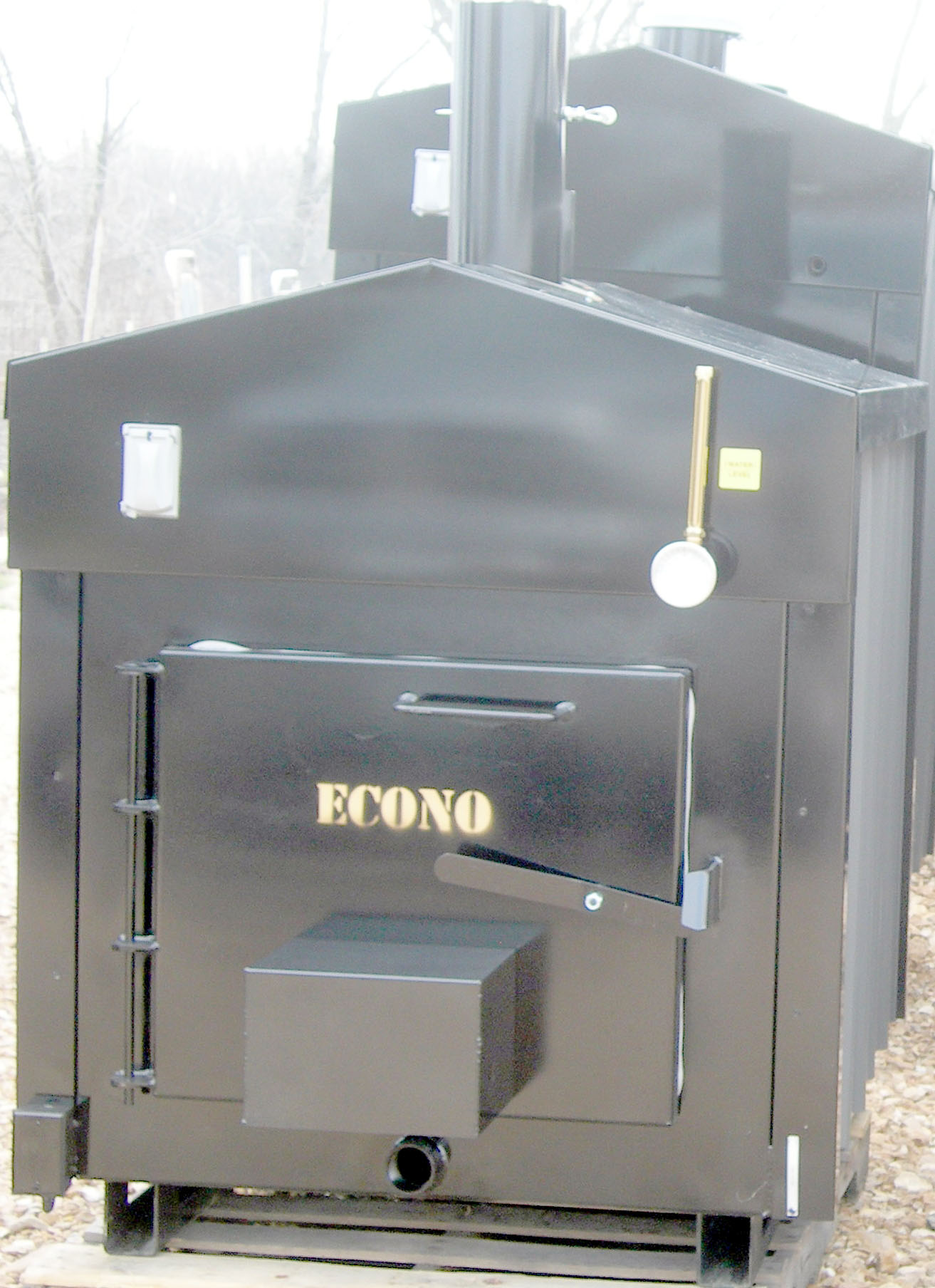 The Econo Outdoor Wood Furnace is built of quality material by Missouri craftsmen in the USA. The water tank is 11 gauge steel, the fire box is 9 gauge steel, with a 6 inch X ¼ inch flue pipe that runs vertical out the top of the fire box through the water tank then out to the atmosphere.